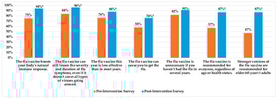 Percentage of correct responses to the knowledge-based true or false statements (pre-intervention survey vs. post-intervention survey) (measurement of vaccine literacy shift). Shown in Figure 2 is a comparison of the percentages of correct responses to the seven true or false influenza knowledge-based statements included in the pre- and post-intervention surveys. “Flu” was used instead of influenza to prioritize the use of plain language throughout the survey. * denotes a statistically significant difference (p < 0.05).