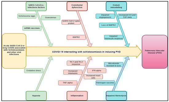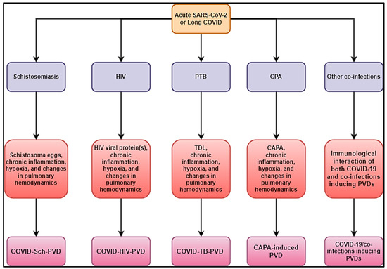 There is a major concern regarding the occurrence and persistence of pulmonary vascular pathology in the post-acute COVID-19 stage and regarding the impact of long COVID, which has been shown to be associated with potential infectious diseases associated with PVDs, primarily schistosomiasis, HIV, tuberculosis, pulmonary aspergillosis, Wuchereria bancrofti, Clonorchis sinensis, paracoccidioidomycosis, human herpesvirus 8, and scrub typhus. The likelihood of observing a high prevalence of PVDs due to co-infections in the post-COVID-19 era is pronounced. This could be explained by long COVID persistently impairing the physiological gas exchange caused by damaged lung architecture, including vasculature, hypoxic vasoconstriction, thrombotic events, direct viral damage, pro-inflammatory cytokines, and microthrombi [11].