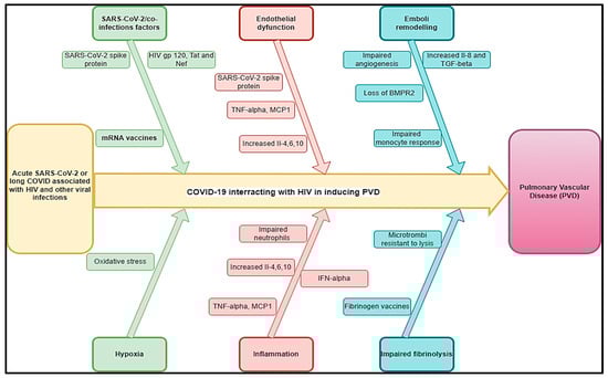 Hypothetical pathophysiology explaining acute SARS-CoV-2 and long COVID associated with HIV and other viral diseases inducing PVDs.