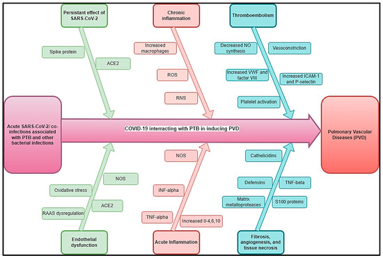 The results showed that 50% of COVID-19 patients were co-infected or carried bacterial pathogens [83]. A global meta-analysis estimated the prevalence of COVID-19/PTB at 7.1% (95%CI: 4.0~10.8%) [84]. However, the incidence of active PTB among COVID-19 patients was higher in high tuberculosis burden countries. The Bordetella pertussis infection rate was significantly higher in COVID-19-positive patients [83]. PVDs associated with B. pertussis infection in infants are strongly correlated with disease severity, with 75% of infants that succumb to infection displaying features of pulmonary hypertension, compared with just 6% of those that survive infection [85]. Other plausible COVID-19/bacterial co-infections that could be associated with PVDs are numerous. In fact, COVID-19, and Pneumocystis jirovecii pulmonary co-infections were associated with extensive vascular thromboses in the pulmonary venous territory and a pulmonary edema focus below the subpleural hemorrhage area. Peri bronchial pulmonary artery thromboses were also observed [86]. Scrub typhus/COVID-19 co-infections were associated with a transient increase in the risk of vascular events, including pulmonary embolism [87].