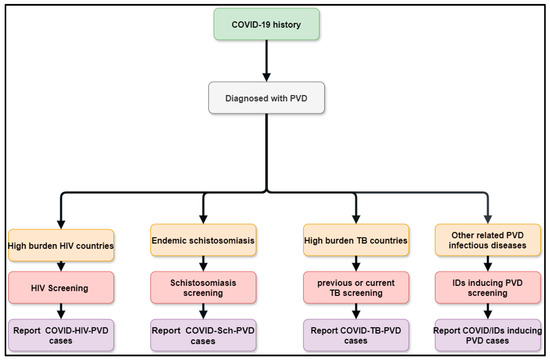 The interactions between possible COVID-19 co-infections that cause PVDs are a novel subject that need additional research to gain a better understanding of the epidemiology, clinical profile, diagnostics, management, and prognostics. This multidisciplinary approach includes schistosomiasis, HIV, PTB, pulmonary aspergillosis, Wuchereria bancrofti, Clonorchis sinensis, paracoccidioidomycosis, and other infections that occur before or after acute COVID-19 or during long COVID phases, human herpesvirus 8, and scrub typhus. This review suggests that the diagnostics of the leading co-infections inducing PVDs should be undertaken in the context of COVID-Sch-PVD, COVID-HIV-PVD, and COVID-TB-PVD, or other related IDs in high-burden or endemic regions (Figure 4). Emphasis should be placed on COVID-Sch-PVD, COVID-HIV-PVD, and COVID-TB-PVD, as studies have shown that active and previous TB as well as HIV were found to be COVID-19 risk factors [89]. Furthermore, COVID-19 outcomes were assessed in relation to schistosomiasis prevalence and treatment coverage. COVID-19 outcomes, particularly active cases and recovery rates, were dramatically improved in schistosomiasis-free African countries [40].