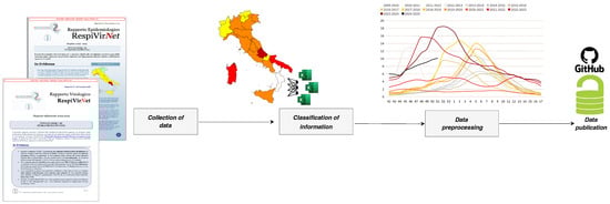 Figure 1 summarized the data production process covering from the digitalization to the release of the dataset. The first step, i.e., Collection of data, was carried out through manual extraction of information from the weekly PDF bulletins published by RespiVirNet [16], the Italian surveillance system of influenza-like illnesses and respiratory viruses, coordinated by ISS with the support of the Ministry of Health, which monitors influenza-like illnesses and respiratory viruses throughout the country.