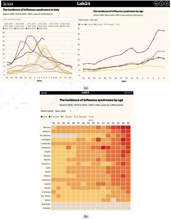 The bulletins contained data on the types of viruses identified (influenza A and B, RSV, adenovirus, etc.), incidence of illness in different age groups, geographic distribution on a regional basis, and time periods defined by epidemiological weeks. This information was collected manually because bulletins were available in unstructured formats, requiring special care to avoid errors during conversion. Once the collection was completed, the information was organized through a classification process that divided the data into main categories, including epidemiological data (incidence rate of ILI by region and age group), virological data (test results for different viruses), temporal data (epidemiological weeks), and geographic data (reference regions). Classification allowed the database to be structured so that it was easily searchable and ready for subsequent analysis, as summarized in Section 3. Next, the classified data underwent a rigorous pre-processing process. This stage included error cleaning, duplicate removal, format standardization and final validation. For example, dates were standardized, geographic codes were made consistent with official references, and all inconsistencies in the data were resolved to ensure that the final dataset was error-free. Finally, the dataset was published on an open-source platform such as GitHub, available at the link: https://github.com/fbranda/influnet (accessed on 2 February 2025), providing free and transparent access to researchers and public health professionals. Publication on GitHub offered numerous benefits, such as the ability to edit the dataset, tracking changes and making future updates available, and the promotion of collaboration with the scientific community, which can report errors or suggest improvements. In addition, collaboration with Il Sole24Ore, one of Italy’s leading newspapers, has played a key role in making the data easily understandable to citizens, as shown in Figure 2a. Leveraging its expertise in data visualization and communication, Il Sole24Ore has helped present information in a user-friendly format, enabling a wider audience beyond researchers and practitioners to consult and interpret the data effectively [17]. This process has transformed raw, unstructured data into a high-quality resource that is accessible and ready for use in advanced epidemiological analyses, predictive models, and strategic decisions about respiratory disease management in Italy.
