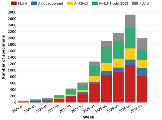Figure 3 illustrates the weekly distribution of major respiratory viruses detected during the 2024–2025 influenza season, characterized by the dominance of influenza A, in line with historical trends. Among the detected subtypes, A(H3N2) and A(H1N1)pdm2009 have shown the highest circulation, confirming their persistent role in seasonal influenza outbreaks. Influenza B, although present, has circulated at lower levels than influenza A, showing a delayed increase in cases toward the second half of the flu season.