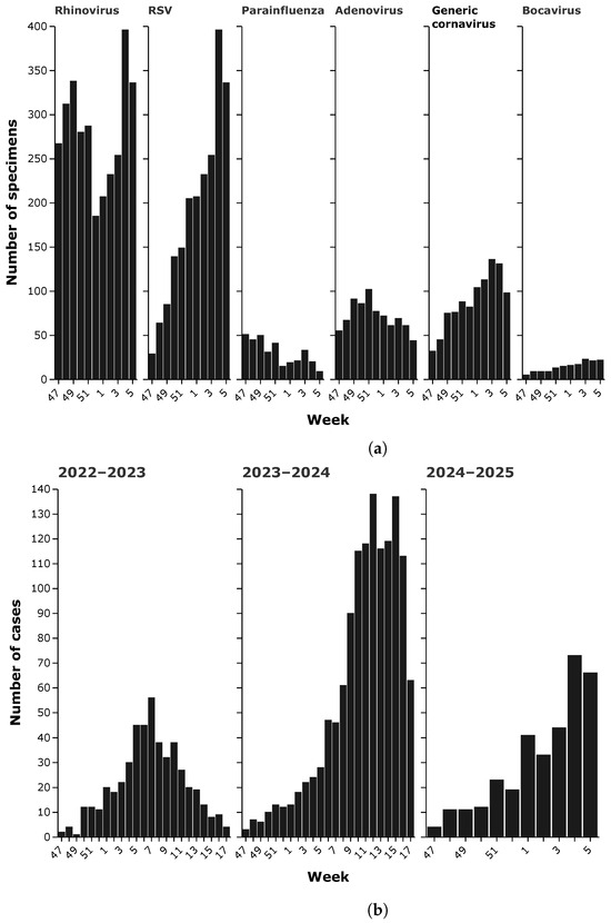 In addition to influenza viruses, other respiratory pathogens contribute significantly to the seasonal disease burden, showing distinct but often overlapping temporal patterns (Figure 4a). As of 2 February 2025, Respiratory Syncytial Virus (RSV) showed the highest detection rate among noninfluenza viruses, with a total of 2114 cases reported during the season. Weekly RSV detections increased steadily from mid-November, with 18 cases in week 46, then increased sharply in December and peaked in early January to a high of 396 cases in week 4 of 2025. The observed decline in February suggests a typical seasonality of RSV, with peak circulation slightly later than influenza. Rhinovirus was another major contributor to respiratory infections, with a total of 3341 detections. Unlike RSV, which showed a sharper peak, rhinovirus circulation remained high throughout the season. Weekly detections fluctuated, with an initial peak of 247 cases in week 46, increasing to a peak of 396 cases in week 4, before showing a gradual decrease. The prolonged presence of rhinovirus underscores its role as a year-round pathogen with recurrent peaks, particularly in the colder months when indoor transmission is facilitated. Generic coronaviruses (excluding SARS-CoV-2) accounted for 1003 cases during the season. Weekly detections ranged from 23 to 136 cases, with a gradual increase starting in late November, peaking in weeks 3–4 of 2025 and declining thereafter. The observed trends are consistent with previous reports of seasonal coronaviruses, which tend to circulate at moderate levels along with other respiratory viruses. Adenovirus was detected in 846 cases, with relatively stable weekly numbers throughout the season. Initial detections of 61 cases in week 46 gradually increased to a peak of 102 cases in week 51, followed by minor fluctuations. Unlike influenza or RSV, adenovirus shows a more prolonged and less defined seasonal pattern, probably due to its ability to persist in the population with sporadic outbreaks. Parainfluenza viruses contributed to 374 detections, following a pattern of moderate fluctuations. The highest weekly count was 51 cases in week 47, after which detections remained relatively stable, with occasional increases. The relatively low detection rate compared to RSV or Rhinovirus suggests a more limited role in seasonal respiratory infections, but still contributes to the overall disease burden. Finally, Bocavirus, although less prevalent, was detected in 164 cases. Weekly numbers remained low throughout the season, with detections ranging from 3 to 23 cases per week. Bocavirus is often associated with pediatric respiratory infections, and its relatively low circulation may indicate a lower prevalence in the general population.