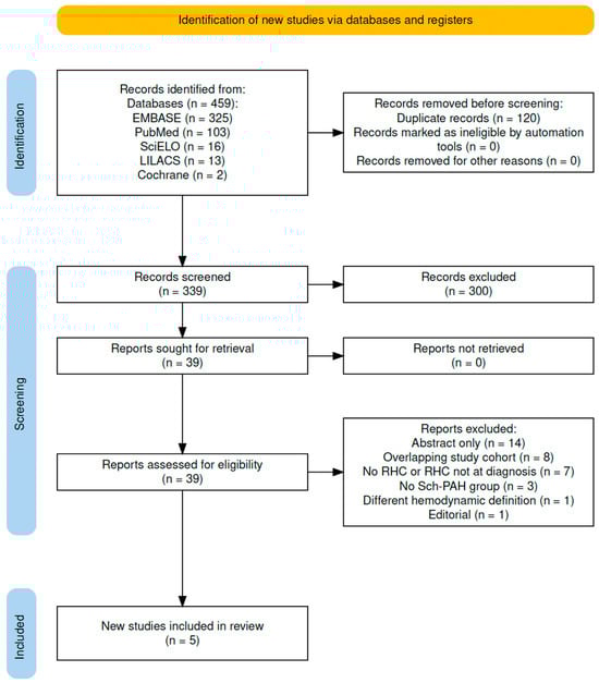 This systematic review and meta-analysis were undertaken in accordance with Meta-Analysis of Observational Studies in Epidemiology (MOOSE) guidelines and the Preferred Reporting Items for Systematic reviews and Meta-Analyses (PRISMA) statement [8,9], Supplementary Materials, Tables S3 and S4. A systematic search of the literature was carried out on 28 October 2024 to identify candidate publications reporting clinical, hemodynamic, and functional data at diagnosis of Sch-PAH patients referred to a PAH reference center in Brazil. This survey included studies published from 1 January 2000 to 1 October 2024. All relevant studies were identified by cross-referencing the medical subject heading terms detailed in Supplementary Materials (Table S1) and were retrieved from the following databases: PubMed, Excerpta Medica Database (Embase), Latin American and Caribbean Health Sciences Literature (LILACS), Scientific Electronic Library Online (SciELO), and Cochrane Library. Articles in English, Spanish, or Portuguese were considered.