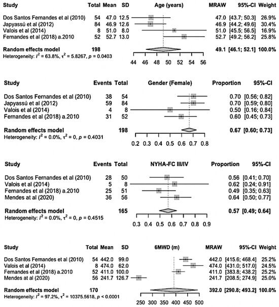 We used R Software version 4.4.2 (RStudio Software version 2024.09.1+394 with “meta” and “metafor” packages, Posit PBC, Vienna, Austria) to perform a single-arm meta-analysis with a random-effect model, in order to accommodate expected high between-study variances. Heterogeneity was assessed visually with forest plots and is presented with both I2 and τ2. Numerical data are presented as means and 95% confidence intervals (95% CIs), and qualitative data as proportions and 95% CIs. NYHA-FC was organized in two categories (FC I/II vs. FC III/IV), due to similar grouping among some of the studies.