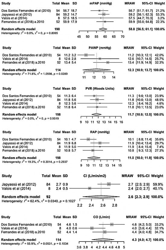 On full-text review, matched articles selected by two authors (C.M.C.L. and A.L.S.F.) were included for data extraction, while mismatched articles were resolved by consensus. One of the authors (A.L.S.F.) retrieved the data from all included studies, and a different author (C.M.C.L.) checked the extraction. Data extracted included study characteristics, patients’ demographics (age and gender), New York Heart Association functional class (NYHA-FC), 6 min walk distance (6MWD), hemodynamics (mPAP, PAWP, pulmonary vascular resistance (PVR), right atrial pressure (RAP), cardiac output (CO), cardiac index (CI) and mixed venous oxygen saturation (SvO2)) and laboratory data (brain natriuretic peptide (BNP) or N-terminal prohormone of brain natriuretic peptide (NT-proBNP)) from all included studies. There were two sets of overlapping samples selected due to complementary data (patients from the same time period at the same Brazilian reference center). One article in one of these sets presented only data categorized into two independent cohorts of patients (before 2010 and after 2010), the earlier one being overlapped. These cohorts were treated as independent studies to minimize bias [13]. For each variable, the authors analyzed the sets of overlapping samples to select the data with the greater sample size.