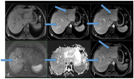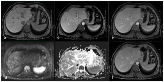 MR scan of the liver after antibiotic treatment: (a) native image; (b) arterial phase; (c) venous phase; (d) diffusion-weighted imaging; (e) ADC map; (f) delayed phase. Narrowing of the originally markedly dilated intrahepatic biliary ducts and regression of pathological opacification are noticeable in the arterial (b), venous (c), and delayed (f) phases. Regression of the pathologic signal was detected in diffusion-weighted imaging (d).