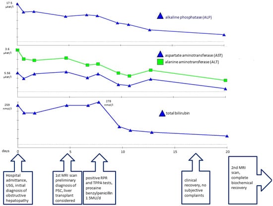 A liver biopsy is not considered necessary for the definitive diagnosis of syphilitic hepatitis as long as there is a positive response to specific therapy. This is due to the histological changes’ nonspecific nature, which makes it difficult to differentiate syphilitic hepatitis from drug-induced liver injury. Histological signs of syphilitic hepatitis may include lymphoplasmacytic and granulomatous portal inflammation with bile duct damage [,]. Direct identification of spirochetes in liver tissue is challenging and rarely successful, whether through immunohistochemical methods or Warthin–Starry staining [,]. Ultrasound and CT scanning usually show only nonspecific pathologies, such as hepatosplenomegaly, hyperechoic liver, and intraabdominal lymphadenopathy [,]. Imaging changes to the bile ducts have been reported infrequently. According to available sources, magnetic resonance cholangiopancreatography (MRCP) has shown only normal findings in the biliary tree and liver in cases of syphilitic hepatitis, with no reports of bile duct dilation. Hussain et al. did not detect biliary tree dilation on MRCP scans in a patient with syphilitic hepatitis []. There are limited data available on changes in the large bile ducts in syphilitic hepatitis. Published cases of icteric syphilitic hepatitis have reported PSC-like changes on MRCP scans in patients with syphilitic hepatitis; however, these patients were also infected with HIV, which is a known cause of secondary sclerosing cholangitis [,,]. In older reports, MRCP was either not performed or the results were not published. In all published cases, causative anti treponemal therapy led to substantial or complete resolution of cholangitis.
