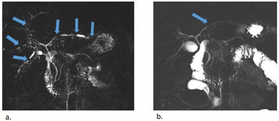 MR cholangiopancreatography before (a) and after (b) antibiotic treatment. Multiple uneven stenoses of the intrahepatic biliary ducts were detectable in both lobes of the liver (blue arrows). Almost complete regression of stenoses was observed after treatment, with minor residual stenoses in the left lobe.