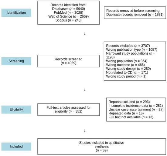 Studies meeting the following criteria were considered for analysis: peer-reviewed papers published from 1 January 2016 to 31 July 2024 in English that focused on observational or preinterventional studies and national surveillance reports. Studies that involved any population such as pediatric, adult, and elderly populations across various healthcare settings (hospitals, intensive care units, internal medicine wards, long-term facilities, nursing homes, and communities) were considered. They were required to investigate outcomes related to CDI incidence, mortality rates, and recurrence while providing clear case definitions in line with current CDI surveillance methods (histological or laboratory diagnosis) or administratively coded CDI hospitalizations using the International Classification of Diseases (ICD) codes such as ICD-9-CM = 008.45 or ICD-10 = A40.7. Additionally, studies needed to report data on incidence rates and relevant details such as case numbers, study populations, or rates, to be eligible for inclusion in the analysis.