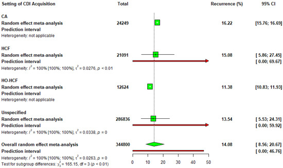 A forest plot of C. difficile infection recurrence rates across different settings of CDI acquisition. Green squares (□) represent the point estimates of recurrence rates for each subgroup in the meta-analysis. The green diamond (◊) indicates the overall pooled estimate from the random-effects meta-analysis. Red horizontal lines (-) represent the 95% confidence intervals (CI) for the recurrence rates, while the red arrows (→) highlight prediction intervals, showcasing the range within which the true effect size of future studies might fall. The horizontal axis displays the percentage of recurrence rates. Text annotations include heterogeneity statistics (I2, τ2, and p-values) and subgroup analysis results.