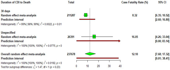 A forest plot of the duration of Clostridioides difficile infection to death. Green squares (□) represent the point estimates of case fatality rates for each subgroup in the meta-analysis. The green diamond (◊) indicates the overall pooled estimate from the random-effects meta-analysis. Red horizontal lines (-) represent the 95% confidence intervals (CI) for the case fatality rates, while the red arrows (→) highlight prediction intervals, showcasing the range within which the true effect size of future studies might fall. The horizontal axis displays the percentage of case fatality rates. Text annotations include heterogeneity statistics (I2, τ2, and p-values) as well as subgroup analysis results.