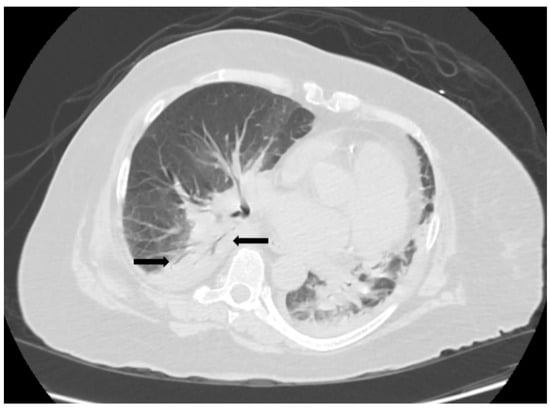 Computed Tomography (CT) of the thorax showing bilateral lower lobe areas of airspace opacity with air bronchogram sign (arrows).