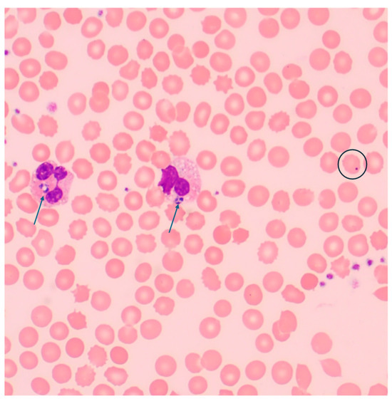 Peripheral blood smear on 50× objective (500× magnification). On microscopic examination of the peripheral smear, numerous neutrophils contained cytoplasmic inclusions consistent with anaplasmosis (blue arrows). Background red cells demonstrated features of asplenism including Howell-Jolly bodies (black circle).