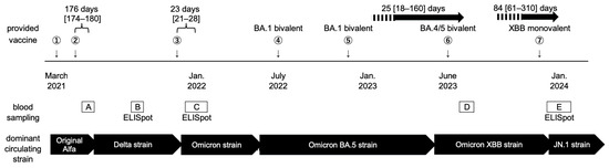 - Ishii, T.; Hamada, K.; Jubishi, D.; Hashimoto, H.; Okamoto, K.; Hisasue, N.; Sunohara, M.; Saito, M.; Shinohara, T.; Yamashita, M.; et al. Waning cellular immune responses and predictive factors in maintaining cellular immunity against SARS-CoV-2 six months after BNT162b2 mRNA vaccination. Sci. Rep. 2023, 13, 9607. [Google Scholar] [CrossRef]