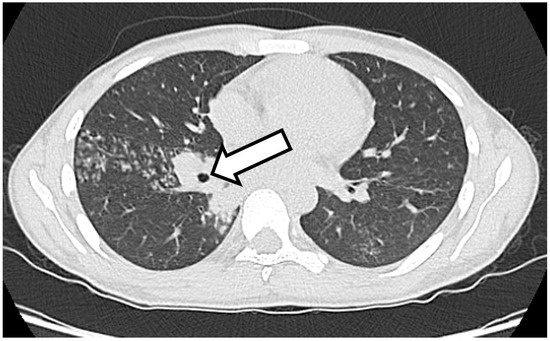 High-resolution chest CT: at the level of the apical segment of the right upper lung lobe, it is possible to see a thickening with contextual cavitation where the arrow is present.