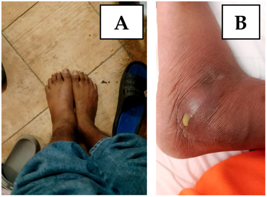 (A) The figure shows the appearance of swelling of the left foot compared to the contralateral one. (B) The figure shows leakage of caseous material from the swelling of the left foot following an exploratory puncture.