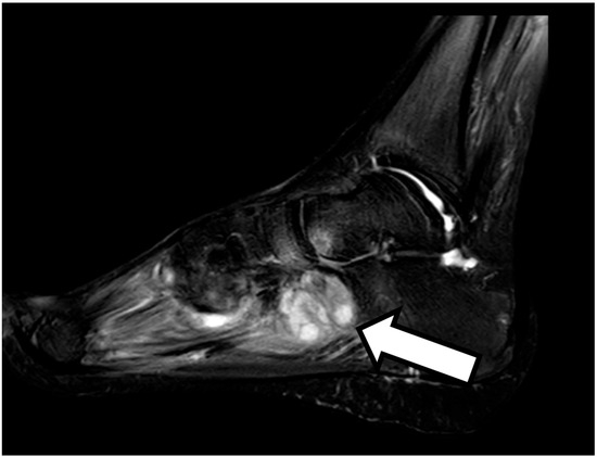 Magnetic resonance imaging with contrast medium of the left foot showing the presence of osteomyelitis affecting the cuboid bone where the arrow is present.