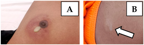 (A) The figure shows an abscess at the left periareolar level with spontaneous leakage of caseous material. (B) The figure shows a skin abscess at the abdominal level, where the arrow is present, that arose approximately 2 months after the start of anti-tuberculosis therapy.