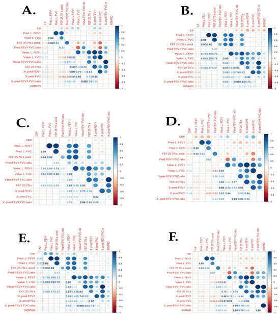 Pearson correlations between inflammatory markers and clinical lung function parameters. (A) correlations between IL-6 and clinical endpoints of population 1; (B) correlations between IL-6 and clinical endpoints of population 2; (C) correlations between CRP and clinical endpoints of population 1; (D) correlations between CRP and clinical endpoints of population 2; (E) correlations between TNF-alpha and clinical endpoints of population 1; (F) correlations between TNF-alpha and clinical endpoints of population 2.