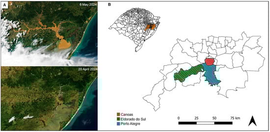 Flood impact in the Metropolitan Region of Porto Alegre. (A) Satellite view of the region before (20 April 2024), and after (6 May 2024) the floods, adapted from NASA’s International Space Station Program [9]. (B) Distribution of the analyzed dogs according to their rescue location in Porto Alegre and its metropolitan region (orange). The map in the upper left corner shows the state of Rio Grande do Sul, Brazil. Maps were generated using QGIS 3.38.0 [10].