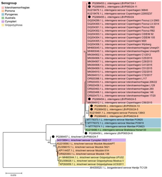 Phylogenetic analysis of partial secY sequences from Leptospira spp. detected in canine samples during the 2024 floods in Rio Grande do Sul, Brazil. The tree was built using the neighbor-joining method (boostrap = 1000) with the Tamura Nei model (gamma = 0.2509). Sequences obtained in this study are indicated (●). Serogroups are grouped by colors: Icterohaemorrhagiae (red), Pomona (orange), Pyrogenes (blue), Australis (green), Cynopteri (purple), Grippotyphosa (yellow). Only the strains from this study exhibited 100% secY identity with previously deposited leptospiral strains were classified at the serogroup level.