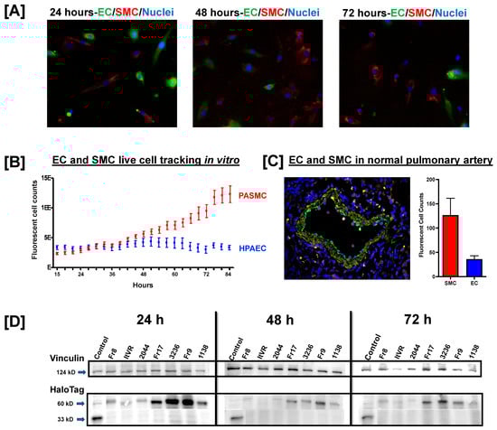Endothelial and smooth muscle cell tracking in pulmonary vascular cell co-cultures, and confirmation of HIV Nef expression post-transfection. (A) Primary Human Pulmonary Artery Endothelial Cells (HPAEC) and Pulmonary Artery Smooth Muscle Cells (PASMC) were labeled with green and red cell-permeant dyes, respectively, seeded in direct cocultures, and tracked using live cell imaging in CELLCYTE X (Cytena). The vascular co-cultures contained HPAEC:PASMC seeded at a 1.8:1 ratio. Cell nuclei were stained with Hoechst prior to imaging at the indicated time points. (B) Quantification of green (endothelial) and red (smooth muscle cells) fluorescent objects over time. The smooth muscle cell population reached a three-fold excess over endothelial cells by the end of the 72+ hours assay. (C) Representative image of norma pulmonary artery stained for von-Willebrand factor (green) and smooth muscle actin (yellow) by immunofluorescence. Nuclei are shown in blue (DAPI). Fluorescent cell counts were documented using Image J and are shown in a bar graph. (D) Confirmation of HIV Nef expression by Nef-HaloTag immunoblotting. Pulmonary artery endothelial and smooth muscle cells were co-cultured and transfected with the indicated HIV Nef fusion constructs. Whole cell lysates from the transfected cells were immunoblotted with anti-HaloTag monoclonal antibody, followed by stripping and reprobing with human vinculin antibody as loading control.