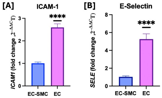 Effects of co-culture model on ICAM1 and SELE gene expression. (A) ICAM1 and (B) SELE mRNA transcripts were quantified using quantitative RT-PCR and normalized to RPLP0. An unpaired t-test was performed to determine statistical significance. Statistical significance: **** p < 0.0001.