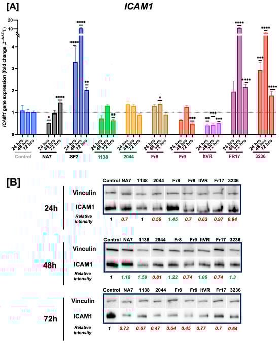 Next, we assessed the gene and/or protein expression of cell activation markers. Our results show statistically significant differences in ICAM1 expression between some of the Nef treatments and the control following Nef transfections (Figure 3). At 24 h after Nef transfections, NA7 (p ≤ 0.05) and ItVR (p ≤ 0.01) showed a significant decrease in ICAM1 gene expression compared to the BL1 control, while SF2 (p ≤ 0.001) and 3236 (p ≤ 0.001) showed an increase. Interestingly, at 48 h post-transfection, SF2 (p ≤ 0.001), Fr8 (p ≤ 0.05), Fr17 (p ≤ 0.0001), and 3236 (p ≤ 0.001) showed a significant increase in ICAM1 gene expression, whereas ItVR showed a significant decrease compared to the control at the same time point. At a later time point, 72 h, NA7 (p ≤ 0.0001), SF2 (p ≤ 0.01), Fr17 (p ≤ 0.0001), and 3236 (p ≤ 0.0001) showed an increase in ICAM1 expression, while 1138 (p ≤ 0.001), Fr9 (p ≤ 0.001), and ItVR (p ≤ 0.001) showed a significant decrease in expression compared to the control at this time point. SF2 was the only variant that showed an increase in ICAM1 expression at all three time points studied, and ItVR showed a decrease in expression at the three time points studied. At the protein level, we observed a decrease in ICAM1 intensity 24 h post-transfection of the NA7 and ItVR variants, which aligns with the RNA expression data. At 48 h, the variants that showed an increase in band intensity corresponding to the RNA data were FR8 and 3236. However, the variant Fr17, which showed a remarkable increase in the expression of ICAM1 after transfection at the protein level, showed a decrease in band intensity at this time point. In addition, at 72 h post-transfection, we observed a decrease in the band intensity for the ICAM1 protein, with all of the nef variants aligning with the RNA data for the 118, Fr9, and ItVR variants, but not for the NA7, FR17, and 3236, which showed an increase in RNA expression instead (Figure 3B).