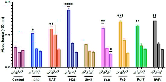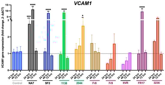 Similarly, VCAM1 was also affected by the transfection of the Nef variants (Figure 4). At 24 h after the transfection of the NA7 variant, VCAM1 expression significantly increased (p ≤ 0.001). In addition, VCAM1 expression also significantly increased 48 h after the transfection of NA7 (p ≤ 0.0001), SF2 (p ≤ 0.0001), 1138 (p ≤ 0.0001), and Fr17 (p ≤ 0.0001). Interestingly, we observed a significant increase in VCAM1 expression 72 h post-transfection with the 2044 variant (p ≤ 0.05).