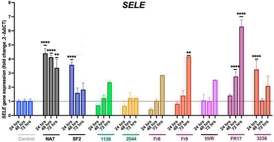At 24 h, there was a significant increase in expression of SELE gene in three Nef variants, SF2 (p ≤ 0.0001), NA7 (p ≤ 0.0001), and 3236 (p < 0.001) (Figure 5). At 48 h, there was an increase seen in NA7 (p ≤ 0.0001) and Fr17 (p < 0.0001). There was an upregulation in SELE at 72 h in PH Nef samples Fr9 (p ≤0.01) and Fr17 (p ≤ 0.0001), as well as in the non-PH variant NA7 (p ≤ 0.01).