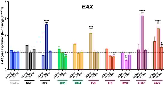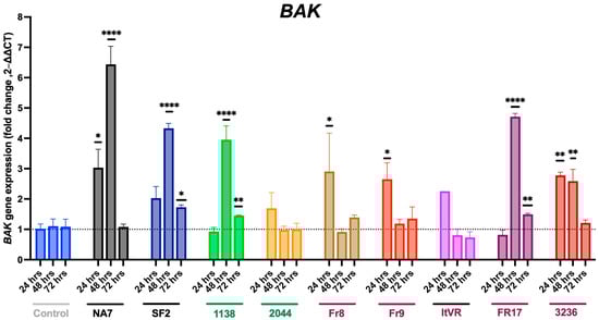 Similarly to what was observed in BAX, our results show that the most significant changes in BAK gene expression upon Nef expression in pulmonary vascular cells occurred 48 h post-transfection (Figure 7). BAK expression significantly increased upon 24 h of transfection of the NA7 (p ≤ 0.05), Fr8 (p ≤ 0.05), Fr9 (p ≤ 0.05), and 3236 (p ≤ 0.01) variants. BAK expression reached its highest level after 48 h with the NA7 (p ≤ 0.0001) variant. Additionally, it also significantly increased in SF2 (p ≤ 0.0001), 1138 (p ≤ 0.0001), and the two PH Nef variants, Fr17 (p ≤ 0.0001) and 3236 (p ≤ 0.01), compared to the control. At 72 h, BAK levels increased after the transfection of SF2 (p ≤ 0.05), 1138 (p ≤ 0.01), and Fr17 (p ≤ 0.01) variants.