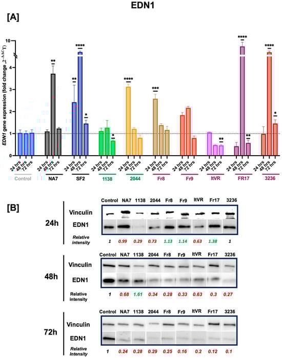 Endothelin-1 contributes to both the initial vasoconstriction response and subsequent vascular remodeling and repair. In this experiment, we sought to measure the gene expression of EDN1 in Nef-transfected cells over time. Our results show significant increases in EDN1 expression at 24 h post-transfection with the 2044 (p ≤ 0.001) and Fr8 (p ≤ 0.01) variants. At 48 h, there was a statistically significant increase in EDN1 in additional variants NA7 (p ≤ 0.01) and SF2 (p ≤ 0.0001), as well as in PH variants Fr17 (p ≤ 0.0001) and 3236 (p ≤ 0.0001). At 72 h post-transfection, we observed an increase in EDN1 expression with the SF2 (p ≤ 0.05) and 3236 (p ≤ 0.05) variants, while there was a decrease shown with the 1138 (p ≤ 0.05), ItVR (p ≤ 0.01), and FR17 (p ≤ 0.01) variants. Additionally, the transfection of the Fr9 variant did not affect EDN1 gene expression at any of the tested time points. In contrast, the transfection of the SF2 variant increased the expression of EDN1 at all three time points studied (Figure 8A). Furthermore, we studied the effect of the transient transfection of these variants at the protein level. At 24 h, we observed an increase in EDN1 with the FR8 variant, aligning with the RNA expression, but not with the 2044 variant. Additionally, we noted a decrease in EDN1 at the protein level with the 1138 variant, even though there were no significant changes at the RNA level. Additionally, at both 24 and 72 h, we observed a decrease in EDN1 across all of the variants studied, except for the 1138 variant at 24 h. The data at both time points did not align with the RNA results, except for the 1138 variant, where we observed a decrease in both RNA and protein levels at 72 h (Figure 8B).