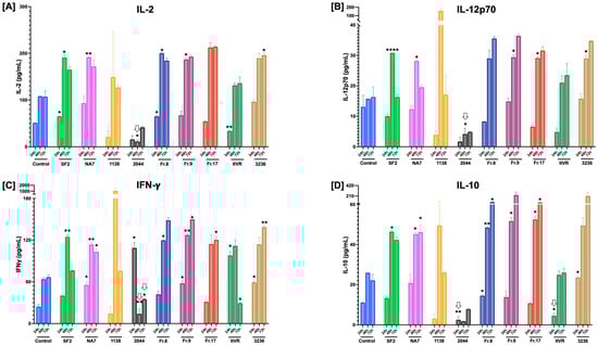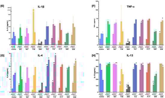 Most of the significant changes in pro-inflammatory cytokines were significant after 48 h in culture, particularly for IL-2, IL-4, IL-10, IL12p70, and IFNγ. Of the samples derived from HIV+ pulmonary normotensive controls, 2044 featured statistically significant decreases in the release of IL-2, Il-12p70, IFNg, IL-10, IL-1b, TNFa, and IL-13, mostly after 24 h. Both NA7 and SF2 exhibited significant increases in Th1 cytokines IL-2, Il-12p70, IFNg, and anti-inflammatory IL-10, as well as Th2 cytokine IL-13. The Nef constructs derived from HIV-pulmonary hypertensive donors demonstrated significant increases in Th1 cytokines IL-2, IL-12p70, and IFNg (Figure 9A–C), as well as anti-inflammatory IL-10 (Figure 9D), but did not elicit innate immunity cytokines IL-1b or TNFa (Figure 9E,F). Th2 cytokines IL-4 and IL-13 were significantly released from cells treated with PH-Nef, particularly after 48 h (Figure 9G,H).