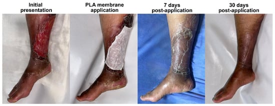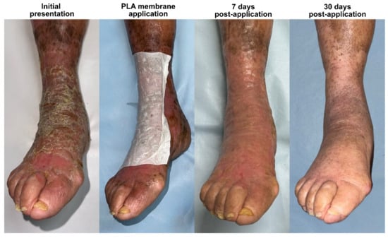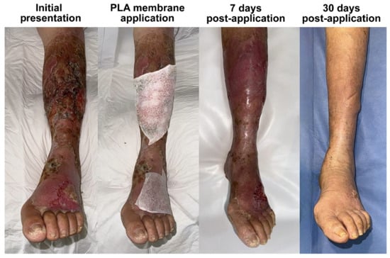 The clinical course of bullous impetigo in a 61-year-old patient with diabetes, presenting with lesions on the dorsum of the left foot and the anterior aspect of the leg, who was hospitalized previously due to a septic shock and presented to our charge once discharged. Each of the affected areas were treated using a PLA membrane, leading to complete epithelialization within 7 days and full restoration of normal skin characteristics by day 30. This case illustrates the ability of PLA membranes to enhance the final tissue quality after healing.