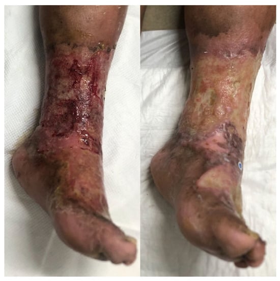 The clinical evolution of a 69-year-old female patient with bullous impetigo and a history of diabetes mellitus type 2 in poor-control, chronic venous insufficiency and active heavy smoking. The left panel shows the initial presentation. Oral antibiotic treatment was initiated (amoxicillin–clavulanate and trimethoprim–sulfamethoxazole), and topical mupirocin was used for 14 days. After 21 days of evolution (right panel), the wound worsened, and a superinfection with E. coli was diagnosed. The patient continued wound care for a total of 12 weeks, during which she presented with several recurrences and tissue breakdown.