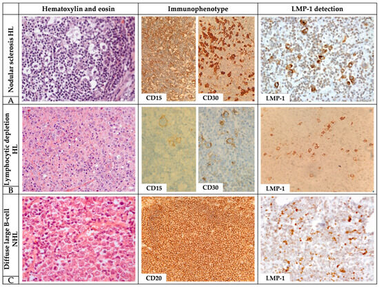 Representative morphology for LMP-1-positive lymphomas: (A) nodular sclerosis HL in HE (40×), CD15, CD30 (60×), and LMP-1 (40×); (B) lymphocytic depletion HL in HE (40×), CD15, CD 30 (40×), and LMP-1 (60×); (C) diffuse large B-cell NHL in HE (40×), CD20 (60×), and LMP-1 (60×). HL: Hodgkin Lymphoma; NHL: Non-Hodgkin Lymphoma; HE: Hematoxylin and Eosin; LMP-1: Latent Membrane Protein 1.