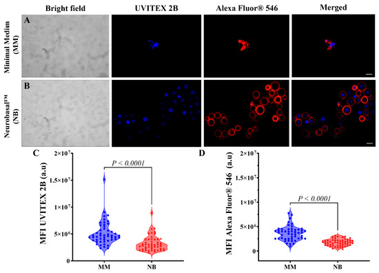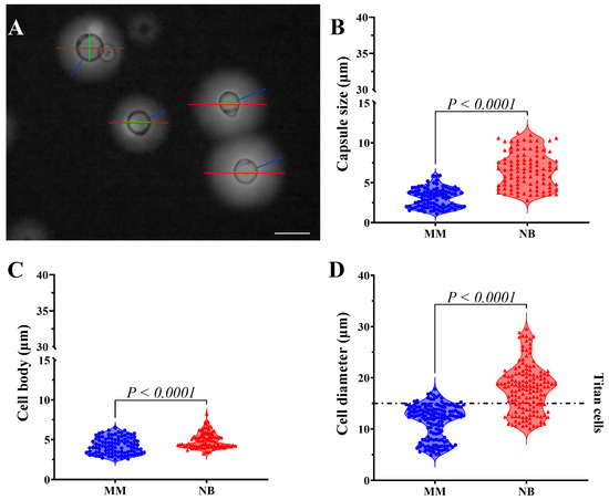 To examine cell morphology in MM and NB, 10 µL of cultures were collected after 5 days of incubation, mixed with 10 µL of India ink, and observed under an Axiolab optical microscope (Carl Zeiss Microscopy, White Plains, NY, USA). Quantifications were performed on at least 150 cells using the ImageJ 1.53t bundled with Java 1.8.0_345 (64 bits) for macOS 15 (Sequoia) software (http://rsb.info.nih.gov/ij/) provided by the National Institutes of Health (NIH, Bethesda, MD, USA) [20,21].
