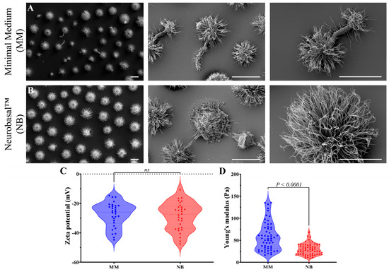 The viscoelastic properties of 10 mg/mL secreted PS solutions in deionized water were analyzed. Values for viscous modulus (G″), elastic modulus (G′), and complex viscosity (η*) were obtained using polystyrene microspheres with a diameter of 1 µm (Polyscience Inc., Warrington, PA, USA, CAS# 07310-15) as probes. Deionized water was used as the experimental control. Measurements were performed on the NanoBrook Omni for both experimental conditions, which were MM- and NB-derived [31,32].