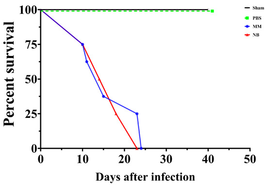 Nutritional environment influences C. gattii virulence in a murine survival model. Kaplan–Meier survival curves of mice infected with C. gattii cultured under different conditions. Control groups (Sham and PBS, black and green lines) maintained 100% survival throughout the 50-day observation period. Mice infected with MM-grown C. gattii (blue line) showed more rapid mortality, reaching 50% at approximately day 15, while the NB-grown C. gattii group (red line) reached the same threshold around day 18. Both infected groups reached 0% survival by day 23, with the delayed mortality curve in the NB group. Statistical analysis was performed using the log-rank (Mantel–Cox) test, and no statistically significant difference was observed between the infected groups. Each group consisted of n = 8 mice.