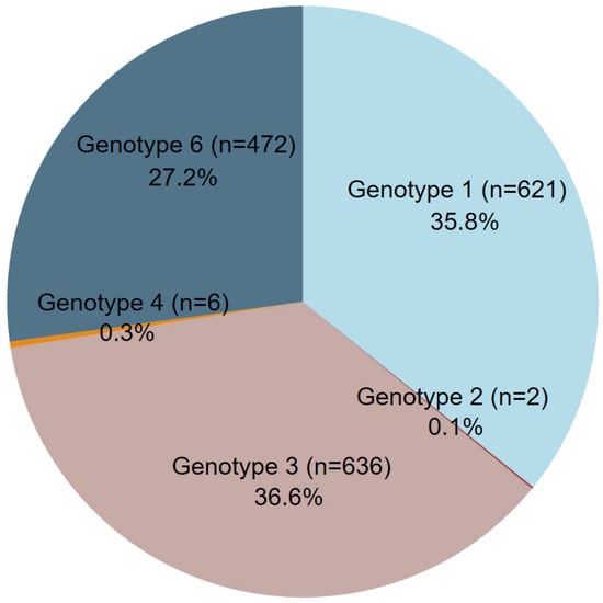 Hepatitis C viral RNA was extracted from 200 µL of plasma using the High Pure Viral RNA Kit® (Roche Diagnostics GmbH, Mannheim, Germany), following the manufacturer’s instructions. Quantification of HCV RNA was performed using the COBAS AmpliPrep/COBAS TaqMan HCV Test v2.0® (Roche Molecular Diagnostics, Pleasanton, CA, USA), a real-time reverse transcription polymerase chain reaction (RT-PCR) assay with a limit of detection (LOD) of 15 IU/mL. Genotyping was conducted using two validated molecular methods: Sanger sequencing (n = 809) from April 2016 to January 2019 and reverse hybridization line probe assay (LiPA) (n = 928) from February 2019 to June 2024. For sequencing, viral RNA was reverse transcribed into complementary DNA (cDNA), followed by PCR amplification of the core region using a set of primers (Outer-forward: 5′-ACT GCC TGA TAG GGT GCTTGC-3′; Outer-reverse: 5′-ATG TAC CCC ATG AGG TCGGC-3′; Inner-forward: 5′-AGG TCT CGT AGA CCG TGCA-3′; Inner-reverse: 5′-CAT GTG AGG GTA TCG ATGAC-3′). Sequencing was performed on an ABI Prism 3130 Genetic Analyzer (Applied Biosystems, Foster City, CA, USA). Sequences were genotyped using the HCV BLAST tool on the Los Alamos National Laboratory HCV database (BLAST, version as hosted on the LANL HCV Sequence Database, Los Alamos National Laboratory, Los Alamos, NM, USA (https://hcv.lanl.gov/content/sequence/BASIC_BLAST/basic_blast.html) (accessed on 10 April 2025)), with reference to the International Committee on Taxonomy of Viruses (ICTV) classification. For LiPA-based genotyping, the VERSANT HCV Genotype 2.0 Assay® (Bayer Healthcare, Tarrytown, NY, USA) was used. This assay is based on the reverse hybridization of amplified HCV RNA fragments to immobilized genotype-specific oligonucleotide probes on a nitrocellulose strip, allowing subtype resolution based on band patterns.