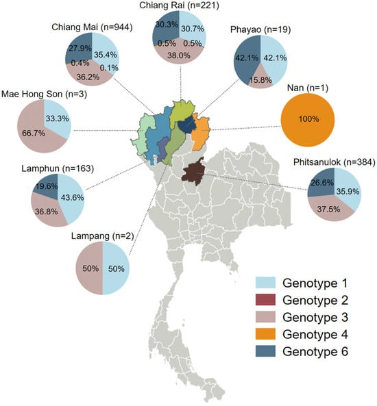 Geographical distribution of HCV genotypes by province in northern Thailand (2016–2024).
