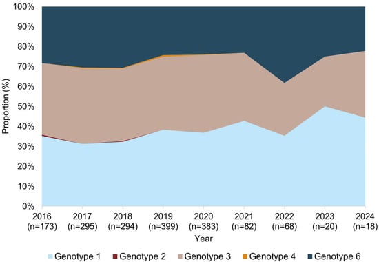 Hepatitis C virus genotype distribution showed notable changes over the study period from 2016 to 2024. Genotype 1 consistently presented across all years from 2016 to 2018 and gradually increased after 2019, while genotype 3 also remained a major contributor, though its proportion varied. A decline in the proportion of genotype 3 was found during 2022 and 2023. Genotype 6 showed a stable trend from 2016 to 2021 but gradually increased the proportion from 2021 onward. Interestingly, genotype 4 exhibited a peak in 2019 before decreasing in subsequent years, whereas genotype 2 was only detected sporadically, with its presence diminishing after 2018 (Figure 3).