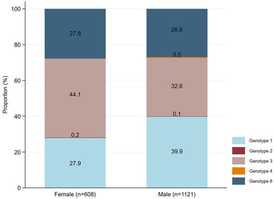 Distribution of HCV genotypes based on sex differences. Different genotypes were indicated by different colors in the key. The percentage was calculated based on the proportion of different HCV genotypes with the total number of males or females. n, the total number of cases who are male or female.