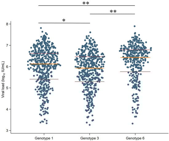 Association between HCV genotypes and level of viral load. The x-axis represents different HCV genotypes, including genotypes 1, 3, and 6. Genotype 2 was missing due to no data for HCV viral load. Each dot represents an individual sample in each genotype. The yellow line indicates the median values and the magenta lines represent the interquartile range. Black lines show the link between two different genotypes. * p < 0.01, ** p < 0.001.