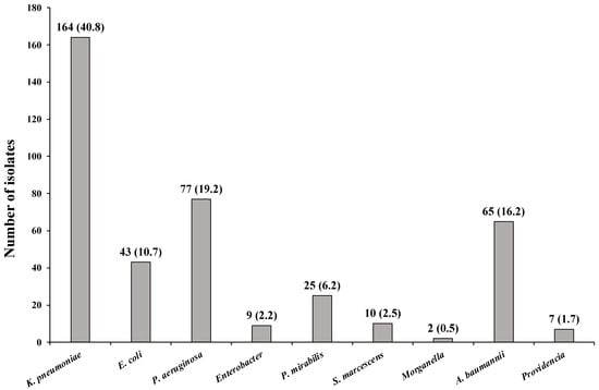 Among the isolated microorganisms, K. pneumoniae was the most frequent pathogen, with 164 (40.8%) isolations, followed by Pseudomonas aeruginosa (P. aeruginosa) at 77 (19.15%), Acinetobacter baumannii (A. baumannii) at 65 (16.17%), and Escherichia coli (E. coli) at 43 (10.7%) (Figure 1).