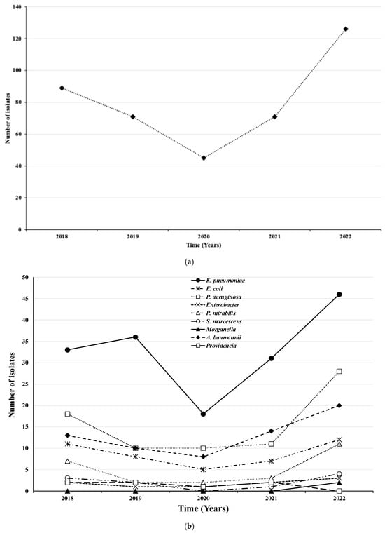 In 2020, the lowest number of isolates was observed for all microorganisms, while the highest values were recorded in 2022 (Figure 2a). The highest numbers of isolates were found for K. pneumoniae (n = 46), P. aeruginosa (n = 28), and A. baumannii (n = 20) (Figure 2b).