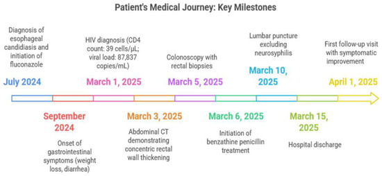 Figure 1 summarizes the patient’s course from esophageal candidiasis treated in July 2024 to the onset of weight loss and diarrhea in September 2024, followed by an HIV diagnosis on 1 March 2025. Imaging on March 3 revealed rectal wall thickening, leading to colonoscopy and biopsy on March 5, initiation of benzathine penicillin on March 6, and lumbar puncture excluding neurosyphilis on March 10. The patient was discharged on March 15 and showed clinical and serological improvement at follow-up on 1 April 2025.